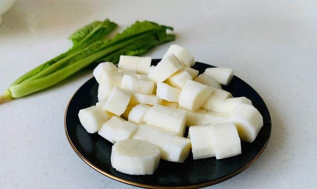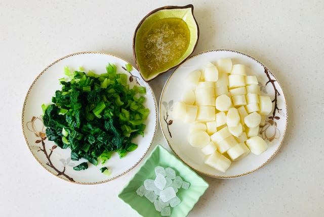 焯水后的小白菜3、把焯水后的綠葉菜,用刀切成小段兒待用。蒸熟的山藥也從鍋中取出待用。